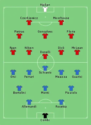 A torrential downpour hampered the Austrians' passing game while benefiting the more varied Italian game. Italy took the lead when a ball broke free from the Austrian goalkeeper because of an intervention by Giuseppe Meazza. The ball then hit the post and was turned into goal by a perfectly positioned Enrique Guaita. In the second half, Austrian efforts to equalize were stopped by Gianpiero Combi, and Italy managed to hold on for the victory.[2]
