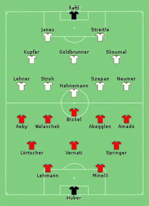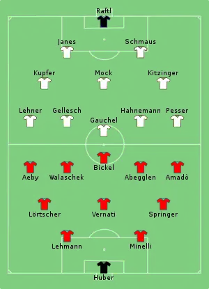 Switzerland adopted a precursor version of the Catenaccio system to try stopping the talented German forwards. Thanks to this tactical system, the Swiss managed to frustrate the Germans despite going behind after a goal from Gauchel. Switzerland drew level with Abegglen after a mistake from Willibald Schmaus. Although the Germans pushed for the win, the game ended with a draw, forcing a replay.[2]