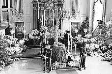 Queen Maud's coffin at Akershus Castle, guarded by four Royal Guards.