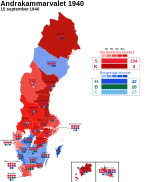 General elections were held in Sweden on 15 September 1940.[1] The Swedish Social Democratic Party remained the largest party, winning 134 of the 230 seats in the Andra kammaren of the Riksdag.[2] It is one of two general elections in Swedish history where a single party received more than half of the vote (the other occasion being 1968).