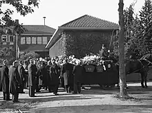 That evening a service was held at the Grote Kerk in Apeldoorn for the other students. The next day, on 11 June 1958, a public service was held in the Catholic Church for the two Catholic boys. Afterwards, the bodies were laid out in the school where the disaster had happened. The coffins were placed on five horse-drawn wagons covered with black cloths and moved to the cemetery. Members of the 4th Company D.K.G. walked next to the wagons with the coffins. Among the many dignitaries was the Schout-bij-nacht of the Commander of the Royal Netherlands Navy J. A. Gauw. A wreath was laid on behalf of Queen Wilhelmina of the Netherlands. Jan Visser was the only survivor of the disaster who attended the ceremony. The other four boys and the teacher were still in the hospital. There were several speakers at the cemetery. Owing to the large number of attendees, people had to wait outside the cemetery.[9][10]