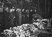 The municipal council decided that the children would be buried together at the municipal cemetery. Two children were buried elsewhere. Initially two other children would be buried at a Catholic cemetery in Apeldoorn, but this was not done. The bodies of the children lay in state in the hospital, with the exception of Piet Kroon, who died last in hospital, and laid in state at his parental home. There were four funerals: on 10 October the funeral of Henk Schuite in Hardenberg; on 11 October the funeral of 20 students and at another place the cremation of pilot Max Christern and his mother took place. On 12 October the funeral of Tonny van Velzen took place in Oud Eik en Duinen. All funerals of the students were attended by dignitaries. Because many children were a member of scouting, members of scouting groups had a role in the different funerals.[9][10]