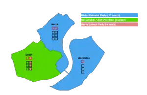 Only the UUP put up candidates in Waterside ward, resulting in all three being elected unopposed:[6]