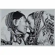 The Caribou Inuit were hunters of caribou in these regions and relied on caribou to supply food, shelter and clothing for their communities.The Caribou Inuit used caribou skin to make parkas to keep themselves warm in frigid climates.[2] They were very careful to make use of every part of the caribou, which was known to be very durable. Due to over hunting and a combination of changing migration patterns and herd distribution, the population of caribou in this region declined vastly.[3] During this time period, the Caribou Inuit were blamed for the declining caribou population, being faced with allegations of being wasteful and overkilling. In the early 1950s the Canadian media reported the starvation deaths of 60 Caribou Inuit.[4] The government was slow to act but in 1959 moved the surviving 60, of around the 120 that were alive in 1950, to settlements such as Baker Lake and Eskimo Point, now Arviat.[4] This set off an Arctic settlement push by the Canadian government where those Inuit living in the north were encouraged to abandon their traditional way of life and settle in villages and outposts of the Canadian North.[4] It was this time that in the former community of Padlei Richard Harrington took his iconic photo of a starving Inuit mother, pressing her nose and lips to those of her youngest child.[5] On February 8, 1950 a few days before Harrington wrote in his journal: