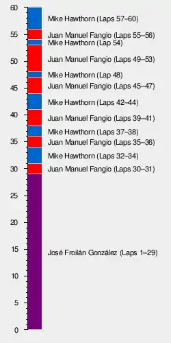 With two laps to go, Fangio and Hawthorn crossed the finish line side by side, followed less than a second later by González and Ascari, also side by side. Hawthorn led into the last lap, with González very close now, but Ascari well off the pace having eased off. Coming into the final straight González was able to overlap slightly on Fangio, but Hawthorn lead the pair, winning the race by just one second from Fangio, with González just 0.4 seconds behind in third place.[1]
