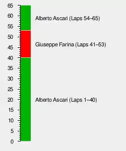 - Car #30: Bonetto (12 laps) then Fangio (17 laps)