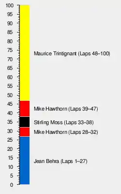 Tony Brooks took pole position in his Vanwall VW 5 but Behra won the start. He led until his brakes failed in his BRM P25, and Mike Hawthorn swept by in the Ferrari 246 F1. Moss (Vanwall VW 5) had been duelling with him throughout the race until he retired on lap 38, and Hawthorn followed suit on lap 47 with a broken fuel pump. Graham Hill (Lotus 12) retired from fourth place in his first race on lap 69, after briefly leading. Vanwall pair Brooks and Stuart Lewis-Evans retired, leaving Trintignant to lead home the Ferraris by some 20 seconds giving Rob Walker his second race win of the year. Behind the Ferraris of Luigi Musso and Peter Collins was Jack Brabham in the factory Cooper T45, although three laps down and still looking a long way from becoming the next years champion. Schell in his BRM P25 was a further six laps behind Brabham picking up the final points after Wolfgang von Trips had an engine failure in the closing stages in his Ferrari 246 F1. The only other car still circulating was the second Lotus 12 of Cliff Allison, 13 laps behind Trintignant.