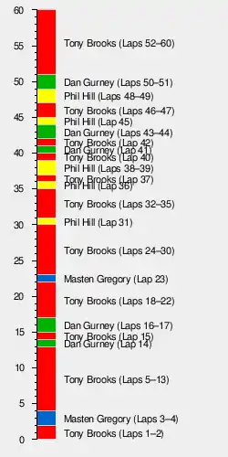 In a unique Formula One race format, first, second and third were all claimed by the same team, Scuderia Ferrari. British driver Tony Brooks was declared the winner ahead of American teammates Dan Gurney and Phil Hill. All three drove Ferrari Dino 246s.