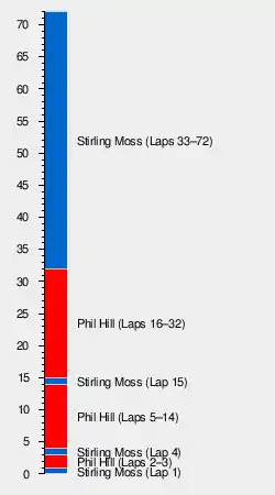 This race was won on the weight of the cars, with Stirling Moss and team manager Rob Walker gambling on running the whole race without a tyre change in the little lightweight Cooper – although they substituted knock-on wheels for bolt-ons in case a pit stop was necessary. Stirling drove a careful race, relying on the Ferrari crew needing to pit. Tony Brooks made a good start but a piston failure eliminated him on the first lap. Graham Hill and then Dan Gurney led, but lost their advantages through clumsy pit-stop action. Moss continued to win at an average speed of 124 mph, a track record. Phil Hill was second for Ferrari on their home track, ahead of a Ferrari 4–5–6 in the order Gurney, Cliff Allison and Olivier Gendebien.
