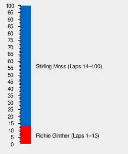 Ginther led Clark and Moss into the first corner but Clark quickly ran into trouble with a faulty fuel pump. Ginther dropped to third on lap 14, when Moss and Bonnier passed him in quick succession.[2] At quarter distance, Moss had an impressive 10 second lead (in the underpowered Lotus 18-Climax)[3] but the Ferraris of Hill and then Ginther found their way around Bonnier and began to close the gap. At half distance, Moss' lead was 8 seconds, and down to 3 seconds on lap 60. Ginther moved into second on lap 75 and tried to close the gap, but Moss proved able to match his lap times, despite the 156's horsepower advantage.[4]