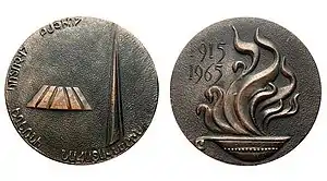 ![]() Medal created in Soviet Armenia. Obverse: "Eternal Memory to the Martyrs of the Holocaust" in Armenian. Dually dated 1915 and 1965. View of the Armenian Genocide Memorial in Tsitsernakaberd. Reverse: Flame in urn, 1915/1965 to upper left | |||