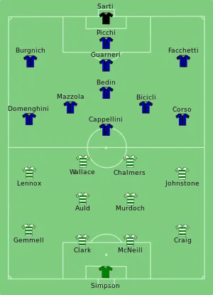 After just over an hour, Gemmell finally managed to equalise for Celtic when Craig passed to him from the right wing and he scored with a powerful 25 yard shot.[17] The balance of play remained the same with Inter defending deeply against sustained Celtic attacking. With about five minutes remaining, a long-range shot from Bobby Murdoch was diverted by Stevie Chalmers past a wrong-footed Sarti – rather than an instinctive intervention, Chalmers and his teammates asserted that they had practiced the same move many times in training.[18] This proved to be the winning goal.[19][20]