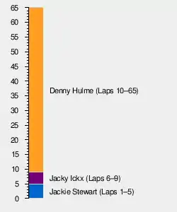 The race was held over 65 laps, however, for the second consecutive race, Bruce McLaren failed to make the start. Of the 16 remaining cars, Jackie Stewart made the best start, with the Brabhams of Jacky Ickx and Jack Brabham in pursuit, Jochen Rindt fourth, and Denny Hulme close behind. By the end of the second lap, led, while Ickx was putting pressure on Stewart. By lap six, Ickx was through, into the lead, and Hulme past Brabham to take third. Hulme overtook Stewart on the next lap, and set about chasing down Ickx. On lap 10, Hulme's McLaren was ahead. Meanwhile, Stewart’s Matra had dropped behind Brabham, and this is how the top four remained throughout the remainder of the race. Rindt ran fifth early on in the race, but bent his suspension on a curb, leading to his retirement, so fifth went to Jean-Pierre Beltoise, with Jackie Oliver finishing sixth in the BRM P139, two laps adrift.[3][4][5][6]