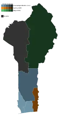 The accusations made against him did not affect Maga's standing in the polls; he received a majority of the vote in the north, and Apithy and Ahomadégbé-Tomêtin received a majority in the southeast and southwest/central, respectively.[6] The election results showed a victory for Maga with 252,551 votes, 200,091 for Ahomadégbé-Tomêtin, and 186,332 for Apithy.[10] In the entire south, Maga received 24,000 votes compared to the 180,000 who voted for him in the Borgou Department, obtaining 97.3 percent of the 78 percent turnout.[11] Zinsou, running to counter the constant tribal clashes, received 3 percent,[12] with 17,551 votes.[10]