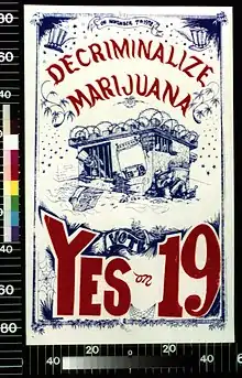 Proposition 19, also known as the California Marijuana Initiative (CMI), was a ballot initiative on the November 7, 1972 California statewide ballot. This was the first attempt to legalize marijuana by ballot measure in the history of the United States.[1] If it had passed, the measure would have removed penalties in the State of California for persons 18 years of age or older for using, possessing, growing, processing, or transporting marijuana for personal use.[2] The California Marijuana Initiative's organizers coordinated a huge grassroots organizing drive to place the measure on the ballot.[3] The initiative qualified for the November statewide ballot in June 1972.[3] The initiative was defeated by the voters with 66.5% No votes to 33.5% Yes votes.[2]