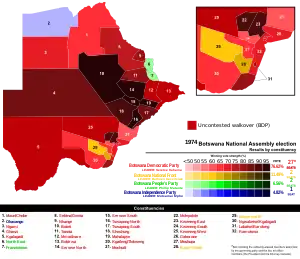 General elections were held in Botswana on 26 October 1974. With 205,050 registered voters, turnout was just 31.22%.[1] The result was a third successive landslide victory for the Botswana Democratic Party (BDP), who won 27 of the 32 elected seats,[2] including four in which they were unopposed.[3] Local elections were held on the same day, with a turnout of just 30.3%, and saw the BDP strengthen its position.[3]