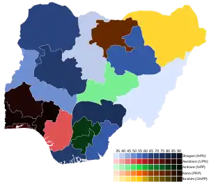 ![]() States won by Shagari (in blue), Awolowo (in red), Azikiwe (in green), Kano (in orange) and Ibrahim (in yellow) | |||||||||||||||||||||||||||||