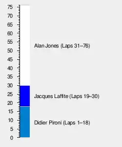 At the start, Pironi led with Laffite holding off Jones and Piquet passing Reutemann for fourth. Pironi held a comfortable lead until lap 19, when he suffered a deflating front tyre followed by a long pit stop to replace it. Laffite led until he too suffered a deflating tyre, causing him to spin off into catch fencing at Hawthorn Bend on lap 31. Thereafter, Jones retained a comfortable advantage over Piquet and Reutemann, while Pironi made a charge from the back of the field, reaching fifth before suffering another tyre failure on lap 64. It was later established that the Ligiers' problems were caused by their wheel rims cracking.[2]