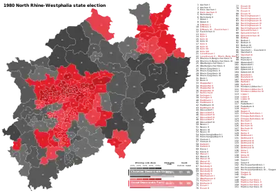 In the previous election held on 4 May 1975, the CDU remained the largest party with an improved lead over the SPD, while the FDP made small gains. The governing coalition retained its majority and was subsequently renewed. In September 1978, SPD parliamentary leader and culture minister Johannes Rau replaced Heinz Kühn as Minister-President.