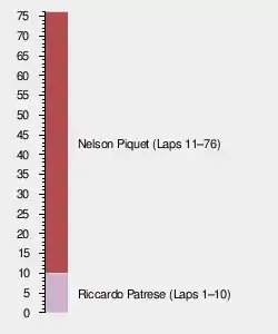 At quarter distance, Piquet led Prost by around 10 seconds, with Patrese a further 10 seconds back and holding up Cheever, René Arnoux, Mansell and Patrick Tambay. On lap 20 Arnoux spun at Surtees, dropping him to the back of the field. There were no further changes among the front-runners until the pit stops, during which both Brabhams hit trouble: Patrese was delayed by a misfitted rear wheel, while Piquet was held up by a malfunctioning wheel-nut gun.[7] Piquet nonetheless retained his lead over Prost, while an unscheduled second stop for Cheever (due to a loose helmet visor which was taped by his pit crew) left Tambay in third and Mansell fourth, with Andrea de Cesaris up to fifth in the Alfa Romeo and Derek Warwick sixth in the Toleman.