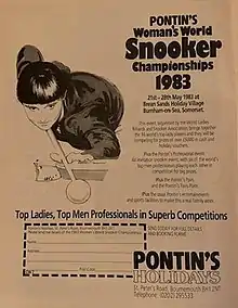 The 1983 Women's World Snooker Championship was a women's snooker tournament that took place from 21 to 28 May 1983 at Pontins Brean Sands Holiday Club, Brean. It was the 1983 edition of the World Women's Snooker Championship, first held in 1976 and was sponsored by Pontins. The tournament was won by Sue Foster, who defeated Maureen Baynton 8–5 in the final.[1][2][3]