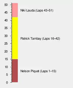 On lap 40, Lauda overtook Fabi at the Parabolica, before passing Tambay for the lead at the Roggia three laps later. Then, on lap 44, Fabi and Tambay suffered engine and throttle failures respectively. This left Lauda with a lead of 20 seconds over Alboreto, with Cheever up to third followed by Johansson, Patrese and the Osella of Piercarlo Ghinzani. On lap 46 Cheever ran out of fuel, followed three laps later by Ghinzani; meanwhile, Patrese passed Johansson for third. At the chequered flag, only Lauda and Alboreto were on the lead lap, with Patrese one lap behind Lauda and Johansson a further lap back. Completing the top six were Jo Gartner in the second Osella and Gerhard Berger in the second ATS, though neither driver would receive points as both their teams had officially entered only one car for the championship.