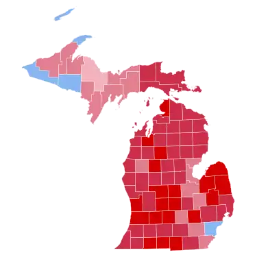 The presidential election of 1984 was a very partisan election for Michigan, with just over 99% of the electorate voting only either Democratic or Republican, though several more parties appeared on the ballot.[2] All but five counties gave Reagan a majority; one (Marquette) gave him a plurality. Mondale carried just four counties, all with a majority: Wayne County (home of Detroit), and tiny Iron, Keweenaw, and Gogebic Counties, all in the Upper Peninsula, a region then typified by heavy unionization and the mining industry. Michigan weighed in for this election as 0.77% more Republican than the national average. As of the 2020 presidential election, this is the last election in which Washtenaw County, Genesee County, and Marquette County voted for a Republican presidential candidate.[3] Bay, Saginaw, and Lake counties would not vote Republican again until 2016.