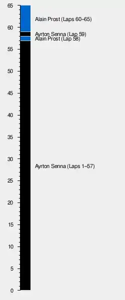The chequered flag was erroneously shown at the end of lap 65, one lap early, with Prost having lapped the entire field. Halfway around what was meant to have been the final lap, Laffite ran out of fuel, which annoyed Piquet – he would have thus taken the final podium place had the error not been made. The final points were taken by Derek Warwick in the second Renault and Marc Surer in the second Brabham.