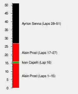 On lap 14 the weather started to come into contention as rain began on parts of the circuit, benefiting Senna. On lap 16 Capelli seized his chance to pass Prost for the lead, the first time a non-turbo car had led a Grand Prix since 1983.[3] Prost had been slowed when Suzuki's Lola had spun at the chicane and got going again just as Prost and Capelli were braking for the tight right-left complex. He then missed a gear coming out of the chicane thanks to a troublesome gearbox and was passed by the March, but Capelli's lead only lasted for a few hundred metres as the extra power of the Honda turbo engine allowed Prost to regain the lead going into the first turn. Capelli made several further attempts to overtake Prost before ultimately retiring three laps later with electrical failure.