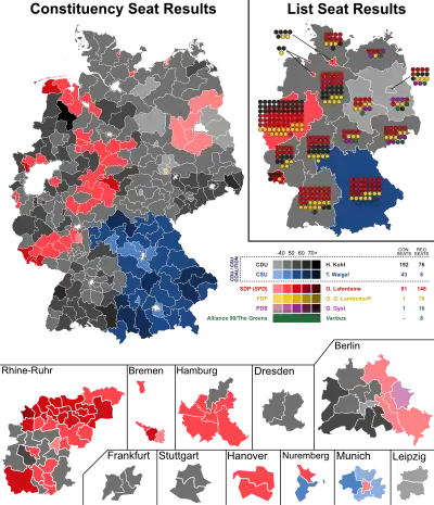 The governing CDU/CSU-FDP coalition was returned to office with a landslide majority, and Helmut Kohl remained chancellor. The CDU did exceptionally well in the former East Germany, which had been the heartland of the SPD before the Nazi era.