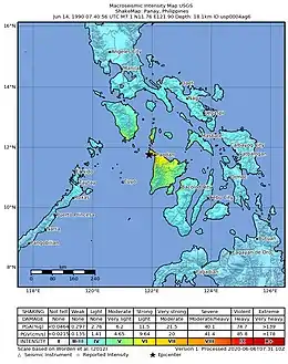 The 1990 Panay earthquake occurred at 3:41 p.m. local time on 14 June 1990 with a moment magnitude of 7.1 in the Richter scale, leaving eight dead and 41 others injured. The epicenter was located at Culasi, Antique on Panay Island in the Philippines. The depth was computed to be 15 kilometers. It was generated by fault movement in the collisional zone off western Panay Island.[1]
