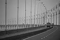The road transport sector experienced rapid changes in the 1990s. Town services as well as inter-city bus transport and private taxicab services significantly improved through introduction of many large bodied modern buses.[11] There were only 133,253 motor vehicles in Bangladesh in 1985 and the number rose to 405,919 in 1999.[12] The construction of Bangabandhu Jamuna Bridge was completed in the second half of the 1990s and the bridge was opened to traffic in 1998. Other important bridges constructed in the 1990s included the Dhalla bridge, the 4th Bangladesh-China Friendship bridge, the Langalbanda bridge and the second Buriganga bridge that linked the national highways and contributed to substantial increase in road traffic.[12] Although the railway network benefited from the increased connectivity from Jamuna Bridge, the sector continued to lose share. The share of the railway sector in passenger traffic declined from 50% in the 1960s to 12% in 1990s and in freight traffic over the same period from 40% to 7%. Due to small volume of traffic and resulting low profitability Faridpur-Pukuria, Bheramara-Raita, Feni-Belonia, and Rupsa-Bagerhat sections of the railway line were closed between 1994 and 1997.[13] Air Transport sector also did not grow much in this decade. As of 1989, there were 14,600 registered carrier departures worldwide which came down to 5,900 by 1999. During the same period number of passenger carried slightly increased from 1.00 million to about 1.22 million per annum.[4]
