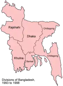 In 1990, Bangladesh was administratively divided into 4 divisions, namely Dhaka, Chittagong, Khulna and Rajshahi which were further subdivided into a total of 64 districts (See List of districts of Bangladesh). The government of under Begum Khaleda Zia chose to change the upazila system and set up instead democratically designed decentralised structures at the appropriate levels.[3] In 1993, Barisal Division was split off from Khulna Division and in 1995, Sylhet Division was split off from Chittagong Division. By the end of the decade, the number of divisions stood at 6.