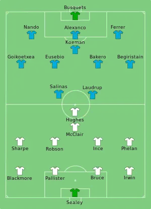 After Koeman scored from a free kick, which came off the upright and hit the legs of United keeper Les Sealey before crossing the line, Barcelona had a late equaliser ruled out for offside and also had a shot cleared off the line. United finished the game 2–1 winners.