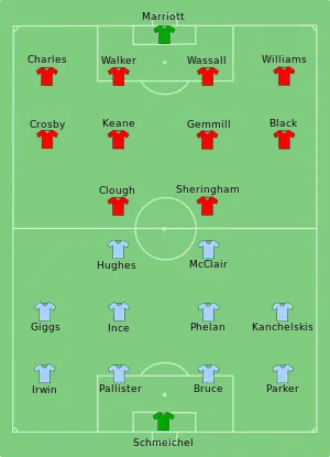 The match began with the two sides limiting each other to midfield play, preventing any significant attacking threats.[31] Nottingham Forest had the first chance on goal in the 6th minute;[30] after a series of passes between Clough and Keane, the latter had a shot saved by Peter Schmeichel in the Manchester United goal. In the 14th minute, United's McClair received the ball from Gary Pallister, and passed it first-time to Giggs on the left wing.[31] Giggs cut inside and then feinted as though he were going to shoot, making the Forest defender, Des Walker, commit; instead, Giggs played a square pass to McClair,[30] who shot low and to the goalkeeper's left to give Manchester United a 1–0 lead.[31]
