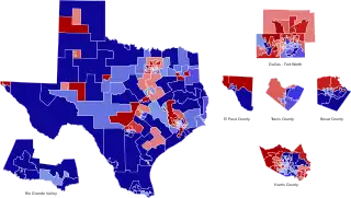Despite Republican George H. W. Bush's victory in Texas in the concurrent presidential election, Republicans made no net gains over the Democrats in the Texas House.[8] A large number of retirements and primary defeats led to a turnover of over 30 House members.[9] In Harris County, a narrow election result in District 144 led to a contested election between Democrat Donald Fogo and Republican Robert Talton. Early ballots had Fogo in the lead, but later counts gave the lead to Talton. A recount confirmed Talton's victory, but Fogo contested the election.[10] A special panel in the Texas House later upheld Talton's victory, flipping the seat to the Republicans.[11]