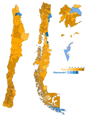 General elections were held in Chile on 11 December 1993 to elect the President, members of the Chamber of Deputies and elected members of the Senate.[1] Eduardo Frei Ruiz-Tagle of the Concertación alliance was elected President, and the alliance also won a majority of seats in the Chamber of Deputies and maintained its majority in the Senate. As of 2024, this is the most recent presidential election that did not result in a runoff.