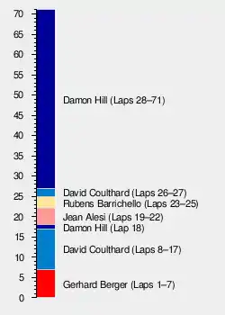The 71-lap race was won by Briton Damon Hill, driving a Williams-Renault. Teammate David Coulthard finished second, achieving his first podium finish, with Finn Mika Häkkinen third in a McLaren-Peugeot. The win, Hill's fifth of the season and third in succession, enabled him to move within one point of Drivers' Championship leader, German Michael Schumacher, while the 1-2 finish allowed Williams to take over the lead of the Constructors' Championship from Benetton.