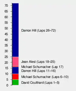 The 72-lap race was won by Damon Hill, driving a Williams-Renault, after starting from second position. Jean Alesi was second in a Ferrari, with Michael Schumacher third in a Benetton-Renault. Hill's teammate, David Coulthard, took the first pole position of his F1 career before retiring with an electrical failure.[3]