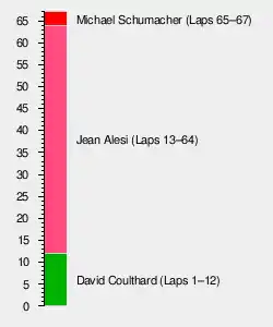 The McLarens and Berger's Ferrari slipped back in the early laps of the race, with both McLarens overtaken by the Pacific and Forti cars as they dropped down the order.[32][36] The McLaren chassis handled badly in the wet conditions, while the throttle response of the Mercedes engine was also too abrupt to be driven effectively in the rain.[8] Berger dropped to ninth place suffering from an incorrectly pressured set of tyres that left him with a handling imbalance.[14] Alesi moved up to fourth position, overtaking Herbert on lap five and Irvine on lap eight.[1] Berger and the McLarens moved back up the order as drivers made a pit stop for slick tyres. As the front-runners made their stops, Alesi ended up twenty seconds ahead of Coulthard, Schumacher and Hill.[32] By the end of lap 17, most of the drivers had pitted for slick tyres and the running order had stabilised as Alesi led ahead of Coulthard, Schumacher, Hill, Berger and Irvine.[1] Frentzen was outside the points in seventh, but on the next lap he collided with Pedro Diniz's Forti while trying to lap him, retiring from the race as a result.[8] Panis and Blundell were also out by this stage, both having spun off the track on lap 15.[1]