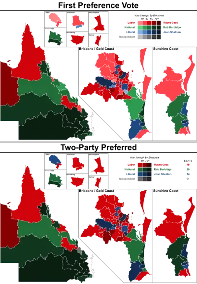 ![]() The top map shows the first party preference by electorate. The bottom map shows the final two-party preferred vote by electorate. | ||||||||||||||||||||||||||||||||||||||||