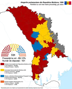 Parliamentary elections were held in Moldova on 22 March 1998.[1] The Party of Communists of the Republic of Moldova (PCRM) emerged as the largest party in Parliament, winning 40 of the 101 seats. However, the three other parties to win seats – the Democratic Convention of Moldova (26 seats), For a Democratic and Prosperous Moldova (24), and the Party of Democratic Forces (11) – formed a coalition government which was later known as the Alliance for Democracy and Reforms, pushing the Communists in opposition until the next elections in 2001.