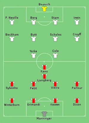 Defender Jaap Stam, "nursing an Achilles injury all summer", was substituted in the second half for David May.[25] Arsenal began the half the better of the two teams and Vieira believed he earned his team a penalty in the 49th minute – it was turned down by Barber. The substitution of Sylvinho for Luis Boa Morte in the 64th minute allowed Ljungberg to play in a natural midfield role.[29] Two minutes later, Arsenal were awarded a penalty. Vieira, chasing down the ball was adjudged to have his shirt tugged by Irwin in the 18-yard box. Kanu converted the penalty, sending Bosnich the wrong way.[29] Yorke soon after mistimed his goal effort after being sent clear by Cole.[29] Substitute Ole Gunnar Solskjær then put Cole through, only for Manninger to produce a one-handed save.[29] Arsenal scored what proved to be the match winner in the 78th minute. A goal-kick by Bosnich was headed back into United's half by Vieira; Kanu controlled the ball "deftly" and set up Parlour, whose shot went into the net.[25] Teddy Sheringham was brought on by Ferguson for Butt with nine minutes of normal time remaining, but with a fourth striker on the field, United were unable to score an equaliser.[28] Luzhnyi later came on for Parlour, the final substitution of the match.[28]