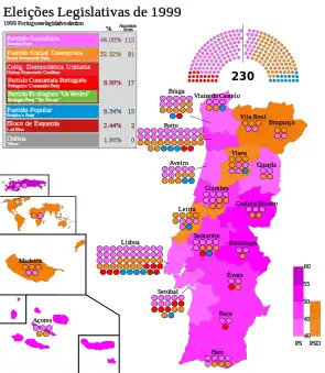 - ↑ The Portuguese Communist Party (PCP) and the Ecologist Party "The Greens" (PEV) contested the 1999 election in a coalition called Unitary Democratic Coalition (CDU) and won a combined 8.6% of the vote and elected 15 MPs to parliament.