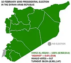 Presidential elections were held in Syria on 10 February 1999.[1] There was only one candidate, incumbent president Hafez al-Assad, with voters asked to approve or reject his candidacy. A reported 100% of voters voted in favour, with a turnout of 98%.[2] Assad was re-elected for another seven-year term. However, he died in June 2000, resulting in an early presidential election that year.