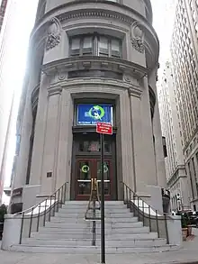 The three-story base is faced with ashlar of granite and Indiana limestone.[6][12][13] At the main corner, facing the intersection of Beaver, Wall, and Pearl Streets, there is a rounded stoop leading to the building's first story. This door is underneath an entablature with a rounded sign reading "THE NEW YORK COCOA EXCHANGE inc."[13][20] Additional entrances were on the building's western end, originally leading to the elevator lobby.[13][16][21] The entrance on Pearl Street, which was formerly located under the Third Avenue elevated line, is more simply designed and contains revolving doors under a canopy.[18] The entrance at Beaver Street has a pediment with carvings of beavers framing a cartouche with the words "munson line building".[20][21][22] The other windows on the first story are generally double-height windows, indicating the presence of the mezzanine inside.[18] Above the second story are ornamental cartouches over carvings of beaver heads.[20][21][22] There are panels between the window groupings on the third story, and a cornice over the third story.[20]