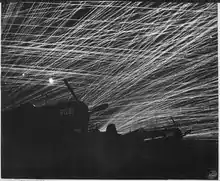 Anti-aircraft fire from Marine AAA Battalions in the vicinity of Yontan Airfield lace the sky during the Battle of Okinawa.