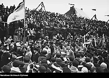 The opening ceremony for the games took place at the Stadium in Zakopane on February 2, 1933.[1] Lord Melchett, honorary president of the World Maccabi Organization, did not attend the ceremony; instead he sent his blessing and an apology - a large statue depicting the persecution of Jews resistance to antisemitism through the ages.[1]