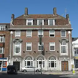 Denman designed the building in a "well-mannered but individual Neo-Georgian style".[7] The walls are of red brick with some Portland stonework. The brickwork is laid in the stretcher bond pattern. The roof, in which there is attic space, is laid with pantiles.[14] The façade is symmetrical, consisting of five bays each with one window on the first and second floors. At ground-floor level, there are entrances in the outermost bays flanking three large round-headed windows, all recessed into a slightly projecting stone-faced section.[7][14] The windows above the entrances are taller than the others and have pediments above them supported on corbels.[7] The other windows are plain sashes, although those at second-floor level have bands and panels of brick around them.[14] Below the attic storey is a stone cornice topped by a brick parapet with decorative urns at each end.[14] The mansard roof, in which three dormer windows are set,[14] "gives a Scandinavian air".[7] An elaborate clock with a decorative case projects prominently from the façade at first-floor level.[14]