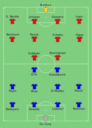 Both teams lined up in a 4–4–2 formation.[19][20] David Beckham was passed fit by Ferguson to play for Manchester United after the midfielder was treated for a back injury he sustained in training.[12][21] Wes Brown and David May were absent with a cruciate ligament and Achilles tendon injury respectively,[12] and Jesper Blomqvist had not recovered from injury to return to first-team action.[14] This was Fabien Barthez's first match.[22]